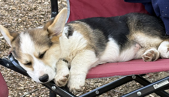 We are very happy here doing chores, riding our horses and raising dogs, watching the sun shine and enjoying the almost perfect California weather. Specifically, we breed Pembroke Welsh Corgis (PWC). We enjoy riding our trusty trail horse duo at the river nearby, in the mountains, at the beach and horse-camping all over northern CA.
